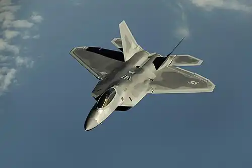 An F-22 Raptor flies over Kadena Air Base, Japan, Jan. 23 on a routine training mission. The F-22 is deployed from the 27th Fighter Squadron at Langley Air Force Base, Va.