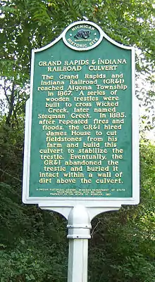 The Grand Rapids and Indiana Railroad completed its railway through Algoma Township in 1867. Porter Hollow was an unincorporated community along this route, about 3 miles north of Rockford. At Porter Hollow the railroad built a large wooden trestle over Stegman Creek, then known as Wicked Creek. In 1883 a flood damaged the trestle, and a local farmer, James House, collected field stones to build the current trestle over the creek. The railroad ceased operations in 1985, and in the 1990s the Michigan Department of Natural Resources redeveloped the railroad right-of-way into a paved hiking and bicycling trail known as the White Pine Trail.[2]