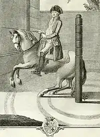 The school's origins as an institution trace to 1726, during the reign of King João V of Portugal, as the Real Academia Equestre da Corte (Royal Equestrian Academy of the Portuguese Royal Court), which served as the riding school of the Portuguese Royal Family and the Portuguese nobility.[4][5] However, prior to its formal creation, the riding school of the Portuguese Royal Family had long been one of the most respected in Europe, since the publication of the seminal "Bem Cavalgar" by King Duarte I of Portugal in 1438.[6]