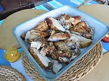 Many other meat dishes feature in Portuguese cuisine. In the Bairrada area, a famous dish is Leitão à Bairrada (roasted suckling pig). Nearby, another dish, chanfana (goat slowly cooked in red wine, paprika and white pepper) is claimed by two towns, Miranda do Corvo ("Capital da Chanfana")[25] and Vila Nova de Poiares ("Capital Universal da Chanfana").[26] Carne de porco à alentejana, fried pork with clams, is a popular dish with some speculation behind its name and its origin as clams would not be as popular in Alentejo, a region with only one sizeable fishing port, Sines, and small fishing villages but would instead have a much popular usage in the Algarve and its seaside towns. One of the theories as to why the plate may belong to the Algarve is that pigs in the region used to be fed with fish derivatives, so clams were added to the fried pork to disguise the fishy taste of the meat.[27] The dish was used in the Middle Ages to test Jewish converts' new Christian faith; consisting of pork and shellfish (two non-kosher items), Cristãos-novos were expected to eat the dish in public in order to prove they had renounced the Jewish faith.[28] In Alto Alentejo (North Alentejo), there is a dish made with lungs, blood and liver, of either pork or lamb. This traditional Easter dish is eaten at other times of year as well. A regional, islander dish, alcatra, beef marinated in red wine, garlic and spices like cloves and whole allspice, then roasted in a clay pot, is a tradition of Terceira Island in the Azores.