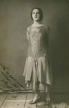 In Riga, Pinkauskaitė debuted in an amateur theater of the Lithuanian community's organization "Pašalpa". Her first role was mother in Three Beloved (Trys mylimosios) by Žemaitė.[2] In 1914, she played a role of mother in comedy Intelligentsia by Dāvids Šveņķis, also staged by the amateurs of "Pašalpa".[3]: 11–12