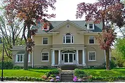 The home was designed by Rock Island architect George Stauduhar in the Colonial Revival style. It also includes elements of the Prairie School style.[3] The Colonial Revival style is found in the main façade’s symmetry, door sidelights, the elliptical fanlight above the door, and in the multiple panes of glass of the upper sashes on the windows. Many of the widows, however, are characteristic of the Prairie style. They have a larger sash with a single pane of glass and are topped with a smaller upper sash. The exterior of the house is covered in stucco. The texture on the lower half of the wall is rough, while the top is smoother. The interior features leather embossed wall coverings in the front entrance, a grand central staircase, mahogany paneling, stained glass, and six fireplaces.[3]