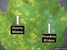 ![]() Example of powdery mildew (right) along with Downy mildew on a grape leaf | |