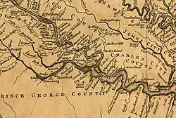 ![]() Powel's Creek shown on the Fry-Jefferson map (1752) between Jordan's Point and the Maycox plantation. | |