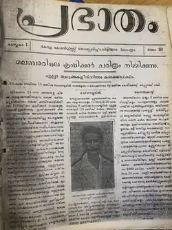 Prabhatham was a Malayalam-language weekly newspaper published from Shoranur in Malabar, British India. Founded in 1935 and edited by E. M. S. Namboodiripad, it was the organ of the Congress Socialist Party (CSP) in Malabar, Travancore and Cochin.[1] The newspaper was subjected to censorship right from its inception. It had to close down due to the heavy security imposed on the paper for publishing a poem on Bhagat Singh's death. The newspaper resumed publication in April 1938. It shifted to Calicut and continued as a weekly until the outbreak of World War II in September 1939. Prabhatham was a short-lived newspaper both because of the colonial repression and because the CSP had lost its relevance after the formation of the Communist Party of India. The newspaper was instrumental in spreading socialist and communist ideologies in Kerala.