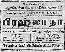 Prahalada is a 1939 Indian Tamil language film directed by B. N. Rao.[1] It deals with the story of Prahlada and his devotion to Lord Vishnu. It was one of the earliest adaptations this mythologic story after the 1932 Telugu version. The story has subsequently been adapted 20 times in numerous languages including Hindi, Gujarati, Tamil, Telugu, Malayalam, Kannada, Bengali and Assamese with most of them being successful at the box office.[2] It is also the one of those rare instances where a story has been adapted so many times, generally to box-office success. The film's story is based on the story of Narasimha and Prahlada. It features M. G. Ramachandran as Lord Indra[3] This was the sixth film of Ramachandran who later became one of the popular actors of the Tamil film industry. The film also featured a sword fight sequence between M.G. Ramachandran and Santhanalakshmi.[2]