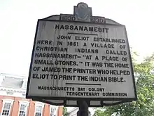 John Eliot was an English colonist and Puritan minister who played an important role in the establishment of praying towns. In the 1630s and 1640s, Eliot worked with bilingual indigenous Algonquians including John Sassamon, an orphan of the Smallpox pandemic of 1633, and Cockenoe, an enslaved Montauk prisoner of the Pequot War, to translate several Christian works, eventually including the Bible, into Massachusett.[2] Having learned enough Massachusett to preach, Eliot began evangelism with the Neponset band of Massachusetts, but was first well received when preaching at in 1646 at Nonantum in present day Newton, meaning "place of rejoicing" in Massachusett. This sermon led to a friendship with Waban (Nipmuc, c. 1604–c. 1685), who became the first Native American in Massachusetts to convert to Christianity.[3]