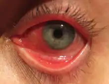 Topical prednisolone is a type of glucocorticoid, mainly used in the ophthalmic pathway as eye drops in numerous eye conditions,[26] including corneal injuries caused by chemicals, burns and alien objects, inflammation of the eyes, mild to moderate non-infectious allergies, disorders of the eyelid, conjunctiva or sclera, ocular inflammation caused by operation and optic neuritis.[27][28] Some side effects include glaucoma, blurring of vision, eye discomfort, impaired recovery of injured site, scarring of the optic nerve, clouding of lenses and urticaria.[28] However, their prevalence is not known.