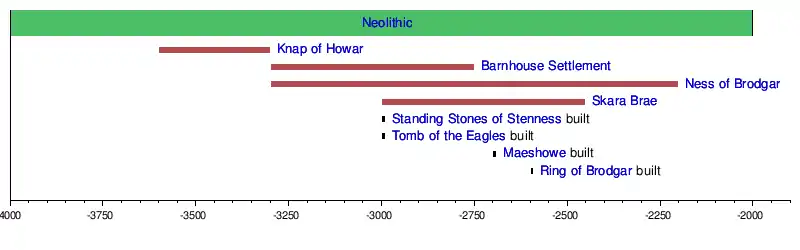 There are numerous important prehistoric remains in Orkney, especially from the Neolithic period. Four of these remains today constitute a World Heritage Site. There are diverse reasons for the abundance of the archaeological record. The sandstone bedrock provides easily workable stone materials and the wind-blown sands have helped preserve several sites.[1] The relative lack of industrialisation and the low incidence of ploughing have also helped to preserve these ancient monuments. In addition, local tradition hints at both fear and veneration of these ancient structures (perhaps inherited from the Norse period of occupation), and these attitudes may have helped prevent human interference with their structural integrity.[2][3]