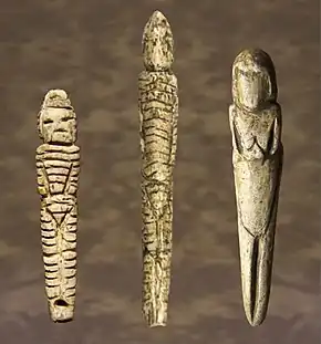 Finds from the Lower Paleolithic appear to be attested between east Kazakhstan and Altai. The burial of a Neanderthal child found in 1938 shows similarities with the Mousterian of Iraq and Iran. In the Upper Palaeolithic, by contrast, most remains are found in the Urals, where, among other things, rock carvings depicting mammoths are found, in Altai, on the upper Yenissei, west of Lake Baikal and around 25,000 on the shore of the Laptev Sea, north of the arctic circle.[5] The remains of huts have been found in the settlement of Mal'ta near Irkutsk. Sculptures of animals and women (Venus figurines) recall the European Upper Palaeolithic.[6] The Siberian Palaeolithic continues well into the European Mesolithic. In the postglacial period, the taiga developed. Microliths, which are common elsewhere, have not been found.