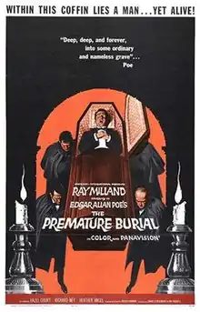 The Premature Burial, also known as Premature Burial, is a 1962 American horror film directed by Roger Corman and starring Ray Milland, Hazel Court, Alan Napier, Heather Angel and Richard Ney. The screenplay by Charles Beaumont and Ray Russell is based upon the 1844 short story of the same name by Edgar Allan Poe. It was the third in the series of eight Poe-themed pictures, known informally as the "Poe Cycle", directed by Corman for American International Pictures.[4]