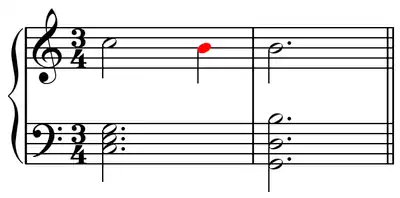 In the following example, the C major chord on the left is a preparation which precedes a nonharmonic tone that serves as an anticipation (center, marked in red) to the G major harmony on the right. This harmony resolves the preceding dissonance: