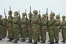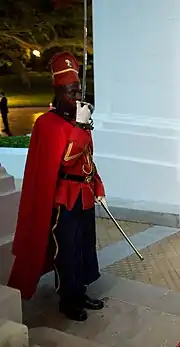 Officers execute present arms with a Sabre in two steps, first is to bring the grip of the sabre to the front of the mouth facing the guard to the left, and then bringing the sabre down to the right lower side of the body next to the right leg facing the blade to the ground in a 30 degree angle to the right.[7]