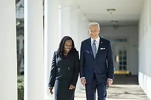 Biden signed into law the American Rescue Plan Act of 2021; a $1.9 trillion stimulus bill that temporarily established expanded unemployment insurance and sent $1,400 stimulus checks to most Americans in response to continued economic pressure from COVID-19.[6] He signed the bipartisan Infrastructure Investment and Jobs Act; a ten-year plan brokered by Biden alongside Democrats and Republicans in Congress, to invest in American roads, bridges, public transit, ports and broadband access.[7] He appointed Ketanji Brown Jackson to the U.S. Supreme Court—the first Black woman to serve on the court. After The Supreme Court overturned Roe v. Wade, Biden took executive actions, such as the signing of Executive Order 14076, to preserve and protect women's health rights nationwide, against abortion bans in Republican led states. Biden proposed a significant expansion of the U.S. social safety net through the Build Back Better Act, but those efforts, along with voting rights legislation, failed in Congress. However, in August 2022, Biden signed the Inflation Reduction Act of 2022, a domestic appropriations bill that included some of the provisions of the Build Back Better Act after the entire bill failed to pass. It included significant federal investment in climate and domestic clean energy production, tax credits for solar panels, electric cars and other home energy programs as well as a three-year extension of Affordable Care Act subsidies. Biden signed the CHIPS and Science Act, bolstering the semiconductor and manufacturing industry, the Honoring our PACT Act, expanding healthcare for US veterans, and the Electoral Count Reform and Presidential Transition Improvement Act. In late 2022, Biden signed the Respect for Marriage Act, which repealed the Defense of Marriage Act and codified same-sex and interracial marriage in the United States. In response to the debt-ceiling crisis of 2023, Biden negotiated and signed the Fiscal Responsibility Act of 2023, which restrains federal spending for fiscal years 2024 and 2025, implements minor changes to SNAP and TANF, includes energy permitting reform, claws back some IRS funding and unspent money for COVID-19, and suspends the debt ceiling to January 1, 2025.[8] Biden established the American Climate Corps and created the first ever White House Office of Gun Violence Prevention. On September 26, 2023, Joe Biden visited a United Auto Workers picket line during the 2023 United Auto Workers strike, making him the first US president to visit one.