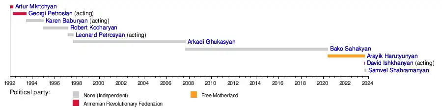 Arayik Harutyunyan was elected president in the 2020 Artsakhian general election.[1][2] He resigned on 1 September 2023. On 9 September 2023, Samvel Shahramanyan was elected president by Artsakh's parliament to replace Harutyunyan.[3]