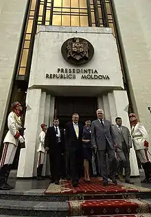 The building was built between 1984 and 1987 by Yuri Tumanean, Arkady Zaltman, and Viktor Iavorski. The building was built on the site of the German Lutheran Church dating back to the 1830s.[1] It was made to be the new building of the Supreme Soviet of the Moldavian SSR.[2][3] The Moldovan Declaration of Independence of 27 August 1991 was signed and adopted in the palace by the Supreme Soviet. After Moldova gained its independence, the building became the residence of the president of Moldova starting in 2001 with President Vladimir Voronin. The building was devastated during protests on April 7, 2009 against President Voronin.[4] As a result of the protest, the palace was closed off.[5][6]