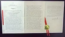The Presidential Unit Citation (Korean: 대통령부대표창; Hanja: 大統領部隊表彰) is a military unit award of the government of South Korea that may be presented to South Korean military units, and foreign military units for outstanding performance in defense of the Republic of Korea.[2] In recognition of allied military service to South Korea during the Korean War, all United States military departments were authorized the unit award for that period.[3]