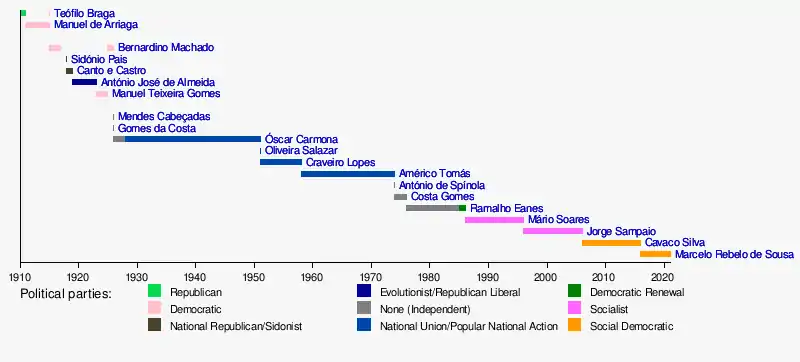 The complete list of presidents of the Portuguese Republic consists of the 20 heads of state in the history of Portugal since the 5 October 1910 revolution that installed a republican regime. This list includes not only those persons who were sworn into office as President of Portugal but also those who de facto served as head of state since 1910. This is the case of Teófilo Braga who served as President of the Provisional Government after the republican coup d'état. Also Sidónio Pais, Mendes Cabeçadas, Gomes da Costa, as well as Canto e Castro and Óscar Carmona in their early months, were not sworn into office as presidents of the Republic, usually being prime ministers, but de facto accumulated this function, thus combining in practice head of state and head of government in one person. See the notes for more information.