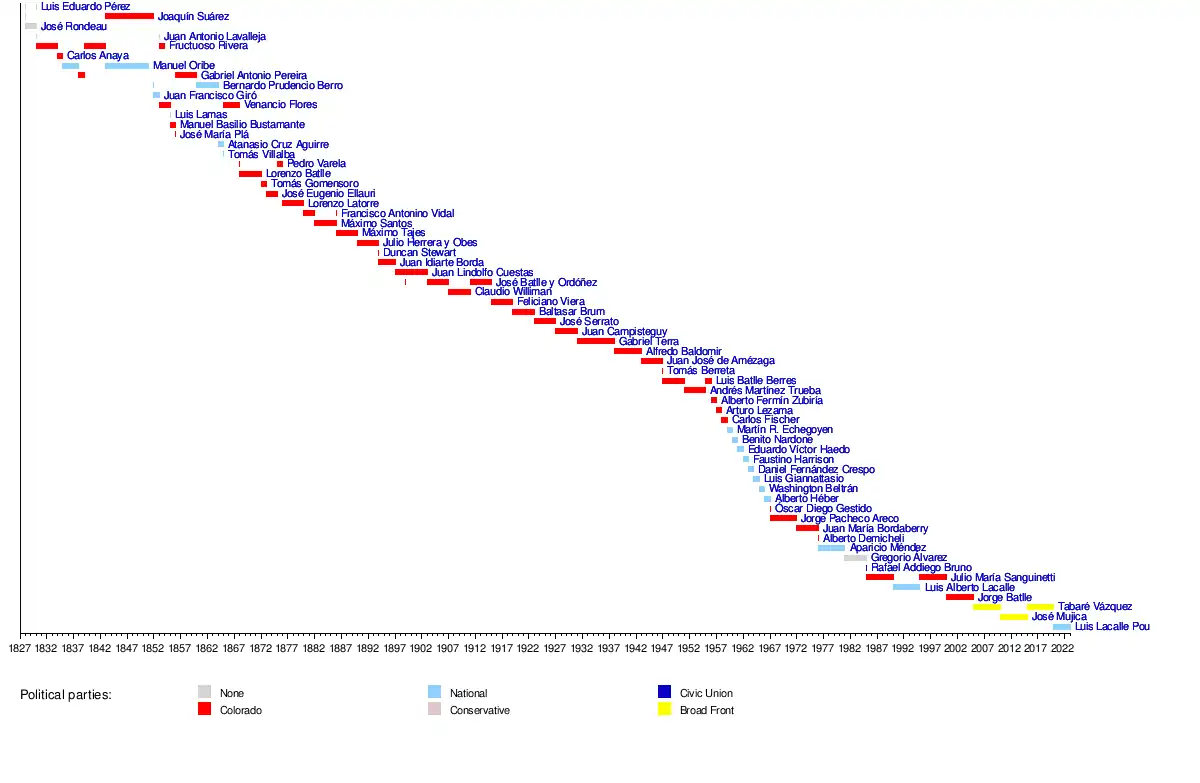 Uruguay is a presidential republic in which the president is both the head of state and head of government. The following is a list of all the people who have held the office of President of Uruguay since 6 November 1830 (when the first constitution was adopted), with the exception of those who held the office of "President" under the National Council of Government, which served as the country's executive directory from 1955 to 1967. The first president of this list is Fructuoso Rivera, who held the office twice and once as part of the Triumvirate that ruled Uruguay from 1853 to 1854.