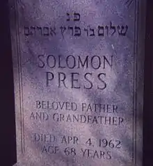 Gravestone of Solomon Press showing Hebrew name Peretz (פרץ)