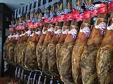 Jamón ibérico (Spanish: [xaˈmon iˈβeɾiko]; Portuguese: presunto ibérico [pɾɨˈzũtu iˈβɛɾiku]), "Iberian ham," is a variety of jamón or presunto, a type of cured leg of pork produced in Spain and Portugal.