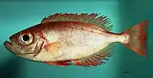 The Atlantic bigeye is a small to medium sized perciform fish. Almost all parts of the fish are entirely reddish-orange, including the eyes. The dorsal fin has 10 spines, and 14 rays. The anal fin has 3 spines and 15 rays. Atlantic bigeye are commonly found at around 14 in. The IGFA world record is 50 cm, or about 20", caught in 2001.[1] The eyes of the Atlantic bigeye are large, due to being primarily nocturnal feeders. Atlantic bigeye form small aggregations near the bottom of the ocean at night.[2]