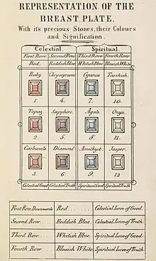 There are different views in classical rabbinical literature as to the order of the names; the Jerusalem Targum, for example, argued that the names appeared in the order according to which they were born. Maimonides describes the jewel stones arranged in four rows, saying that on the first stone belonging to Reuben were also engraved the names of Abraham, Isaac and Jacob, while on the last stone belonging to Benjamin were also engraved the words "the tribes of God";[8] kabbalistic writers such as Hezekiah ben Manoah and Bahya ben Asher argued that only six letters from each name were present on each stone, together with a few letters from the names of Abraham, Isaac, or Jacob, or from the phrase "[these are] the tribes of Jeshurun", so that there were 72 letters in total (72 being a very significant number in Kabbalistic thought).[9] Other researchers, such as Paul Phelps, believe that the order of gemstones that are displayed on the chestpiece correlates to the order that Ezekiel viewed the gates of Zion, as each gate represents one of the twelve tribes, with the gates themselves being studded with gemstones.[10]