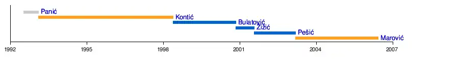 | 2 | Radoje Kontić (born 1937) | Montenegrin | 9 February 1993 | 19 May 1998 | 5 years, 99 days | DPS | – | |