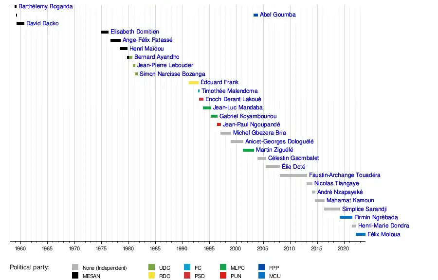 30 March 1959[6] | 30 April 1959 | 31 days | MESAN | Served as Acting Prime Minister; had an internal struggle for power with Dacko after Boganda's death. | |
