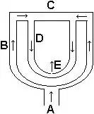 To light the stove, the user pours a small amount of alcohol into a circular "spirit cup" just below the burner and lights it to heat the burner assembly. When it is hot, the user pressurizes the tank by means of a small hand pump integrated into the housing, which forces kerosene from the tank up through the rising tube (A) and the ascending pipe (B) to the pre-heated burner head (C), where the fuel is heated and vaporized. The kerosene vapour is then forced under pressure through the descending tube (D) to the vapor nozzle (E); here it sprays through a jet in the middle of the burner, where it mixes with air and burns in a sootless blue flame. The heat from that flame vaporizes more fuel to sustain the process when the spirit cup burns out. The user can pump the tank more to increase the pressure and make the flame larger; turning a small "air screw" (usually located in the filler cap) will release pressure from the tank and make the flame smaller.[11]