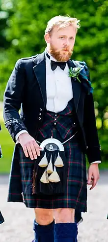 The Prince Charlie jacket is a formal black-tie jacket for Highland dress that was initially listed in tailor catalogs of the early 1920s as a coatee. Over the next couple of decades it became called a Prince Charlie (PC). When introduced, it was marketed as an alternative to the regulation doublet and was to be worn with a black or white bow tie, else white lace jabot, as well as a tartan or red waistcoat (vest). Today the waistcoat is usually made of the same material as the coat. It is a formal evening jacket and not suitable to be worn for day dress with a long tie.