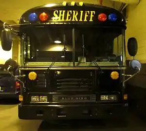 The Blue Bird All American FE Cuyahoga County Sheriff's Office Prisoner Transport Bus. This bus makes five trips a week from the county jail to other prisons with 30 prisoners on board.