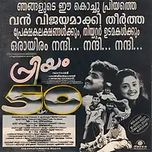 Priyam is a 2000 Indian Malayalam-language romantic comedy film directed by Sanal and starring Kunchacko Boban and Deepa Nair with then-kids Arun, Ashwin, and Manjima Mohan in supporting roles.[1][2][3] This film is inspired by the Hindi film Hum Hain Rahi Pyar Ke (1993).[4]