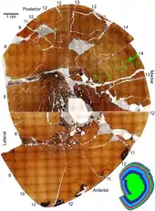 The describing article also published the result of histological research of the bone structure of the left shinbone of the type specimen. This bone showed fourteen LAGs, lines of arrested growth, that likely represented yearly seasons of low food intake. The age of the holotype would thus be about fourteen years. The distance between the lines indicated this individual had not yet reached its maximum size, but closely approached it, proof that it was not simply a subadult Brachylophosaurus specimen with a small crest.[2]