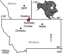 In 1981 and 1994, Mark Goodwin of the University of California Museum of Paleontology excavated limb bones and a vertebra near Rudyard in the north of Montana, at a site originally discovered by Kyoko Kishi. After a school class found some more bones, in 2007 and 2008 a team of the Museum of the Rockies secured the remainder of a hadrosaur skeleton, among which the skull. The fossil was donated to the Museum of the Rockies by land owners Nolan and Cheryl Fladstol; and John and Claire Wendland.[2] In 2009, 2010 and 2011, the find was reported in the scientific literature as a possible new species of Brachylophosaurus.[3][4][5]