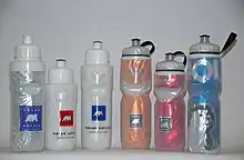 The Polar Bottle was invented by Robert Heiberger, with prototypes being made as early as 1989.[1] Heiberger, a mechanical engineer working with heat loss in the medical technology design field, realized that the systems he employed to warm blood samples to body temperature could be used in reverse to keep liquid cool in a bottle.[1] The bottle features a dual-wall construction which creates a layer of insulating air between the liquid inside the bottle and the outside environment. Between the two bottle layers is a thin foil liner that reflects solar energy away from the bottle. The bottle is – and has always been[2] – made from BPA- and Phthalate-free Low-density polyethylene. It is produced in 24-ounce (710 ml) and 20-ounce (590 ml) sizes. The bottles are blow-molded in Denver, CO.[2] Since the Polar Bottle’s introduction, it has undergone continual improvements[1] to both form and function. The first of these changes occurred in 1998 when a removable valve system was added to the cap to facilitate cleaning. In 2006, the bottle’s entire aesthetic was updated with a sleeker body design, the addition of a carrying strap, and the introduction of a variety of colored liners.[2] In 2010, the company added 8 new graphic designs to their existing array of colored liners[4] and, in response to consumer feedback, reduced the thickness of the bottle walls to make squeezing the bottle easier.[5]
