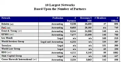 Table of largest professional services networks based upon the number of partners from survey conducted in 2011 of 200 legal and accounting networks from sources above. The table does not reflect the level of development of the network. Accounting networks are far more developed.
