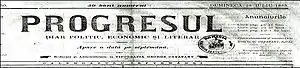 Progresul was a weekly newspaper published in Bârlad, Romania. The newspaper was first printed on 9 November 1883, at the G.V. Munteanu printing shop. Though claiming to support the Liberal Party, the newspaper published mostly cultural articles, contributed by the professors of the Gheorghe Roşca Codreanu High School. The newspaper also supported the Nathalie Drouhet Girls' Boarding School of Bârlad. The last number of the newspaper was printed on 1 January 1884. [1] [2]
