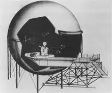 The Projection Planetarium was a training device housed in the Flight Research Laboratory hangar at NASA's Langley Research Center in Hampton, Virginia. It consisted of a custom designed star projector surrounded by a 40 feet (12 m) diameter sphere constructed from a surplus 53 feet (16 m) radome.[1] The star projector was movable in 3 directions while the capsule mockup and its pilots remained static. The system was used in studies of manual control of spacecraft using "out the window" visual information both in orbit and in a launch abort scenario. The planetarium was constructed in 1965 at a cost of $153,103 for research and development and $177,000 for construction and materials. An additional $145,400 worth of surplus materials were made use of in the project.[2][3]