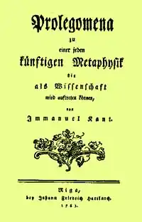 Prolegomena to Any Future Metaphysics That Will Be Able to Present Itself as a Science (German: Prolegomena zu einer jeden künftigen Metaphysik, die als Wissenschaft wird auftreten können) is a book by the German philosopher Immanuel Kant, published in 1783, two years after the first edition of his Critique of Pure Reason. One of Kant's shorter works, it contains a summary of the Critique‘s main conclusions, sometimes by arguments Kant had not used in the Critique. Kant characterizes his more accessible approach here as an "analytic" one, as opposed to the Critique‘s "synthetic" examination of successive faculties of the mind and their principles.[1]