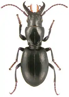 Promecognathus is a genus of ground beetles in the family Carabidae. There are at least two described species in Promecognathus.[1][2][3][4] Both species of Promecognathus are known to predate upon Xystocheir dissecta, which is a species of flat-backed millipede that produces cyanide as a chemical defense. The beetles do not avoid exposure to the defense, meaning they are likely physically resistant to cyanide. [5]