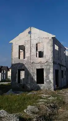 A sample of Gabrielle unit construction at Manchester 1 Village, Lancaster New City, Barangay Navarro, General Trias, Cavite showing cracked pre-cast panels and the absence of vertical posts and horizontal beams.