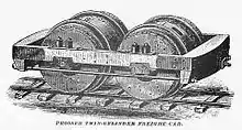 The Prosser Twin Cylinder freight car was intended to revolutionize the transport of grain by carrying it in two enormous iron cylinders about 8½ feet long and 6½ feet in diameter, each revolving on an axle running through its center, at the ends of which were the journal boxes. Effectively, the car would possess no superstructure, and instead the cargo would be carried inside the car's axles themselves. Steel tires, flanged and fitted to the gauge of track, were put around the cylinders, which served as the wheels of the car.[1] The Westinghouse Air Brake Company developed a system of air brakes specifically for this type of freight car.[4]