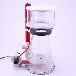 A protein skimmer or foam fractionator is a device used to remove organic compounds such as food and waste particles from water. It is most commonly used in commercial applications like municipal water treatment facilities, public aquariums, and aquaculture facilities. Smaller protein skimmers are also used for filtration of home saltwater aquariums and even freshwater aquariums and ponds.