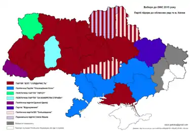 Legislative power in the oblast governments is exercised by their respective oblast councils, which in turn supervise the activities of local administrations.[4] They also have considerable budgets managed by an oblast council (Ukrainian: обласна рада) made up of people's deputies (representatives) voted into office in regional elections every four years, the last of which took place in 2020.