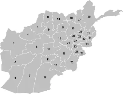 | Zabul | 17 | AF-ZAB | ZBL | Qalat | 17,472 | 304,126 | 402,899 | 22.0 | 9 | South West | South |