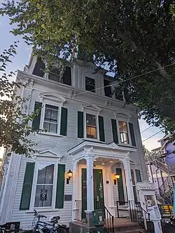 The former Provincetown Public Library building stands on Commercial Street, Provincetown's principal commercial street, at the northwest corner with Freeman Street. It is a 2-1/2 story wood-frame structure, with a mansard roof providing a full third story. The exterior is finished in wooden clapboards, and the roof features a mansarded turret at the center of the front facade. The front is three bays wide, with a center entrance. Windows are sash, and are framed in a variety of different bracketed moulded hoods, some featuring simple cornices, with others have segmented-arch or triangular pediments. The main cornice is adorned with paired brackets, and a second cornice marks the transition between the differing slopes of the roof. A 1970s addition extends the building to the rear.[2]
