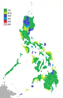 Provinces based on number of regular Sangguniang Panlalawigan seats: greens at least 10, blues 8, and reds 6.