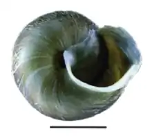 The shell has 4.5–52⁄3 whorls.[1] The width of the shell is 19.4–22.3 mm, and the height of the shell is 9.7–11.1 mm.[1]