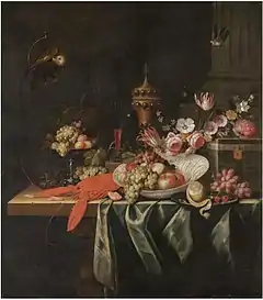 About 100 works have been attributed to the Pseudo-Simons.[4] None of the works are signed.[2] These works are principally fruit still-lifes, along with some flower still lifes and pronkstillevens (sumptuous still-lifes of luxurious objects).[1] His style and subjects show the influence of his contemporary Flemish painters.[2]